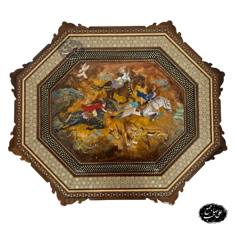 اگر به دنبال یک اثر هنری اصیل ایرانی برای دکوراسیون منزل یا محل کار خود هستید، تابلو نقاشی شکار شیر با قاب خاتم بهترین انتخاب است. این تابلو ترکیبی از هنرهای سنتی ایران شامل خاتم‌کاری اصفهان و نقاشی مینیاتور دست‌ساز است که توسط استادکاران ماهر ساخته شده است.
