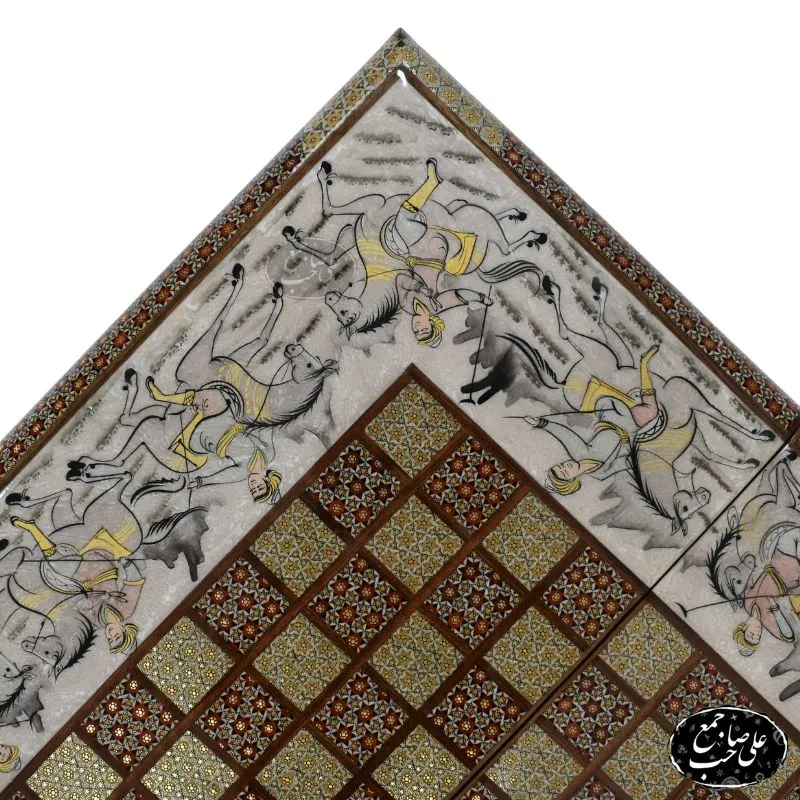 تخته نرد خاتم با نگارگری چوگان سیاه قلم 50 در 50 کد 145