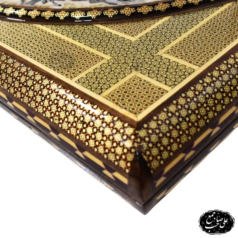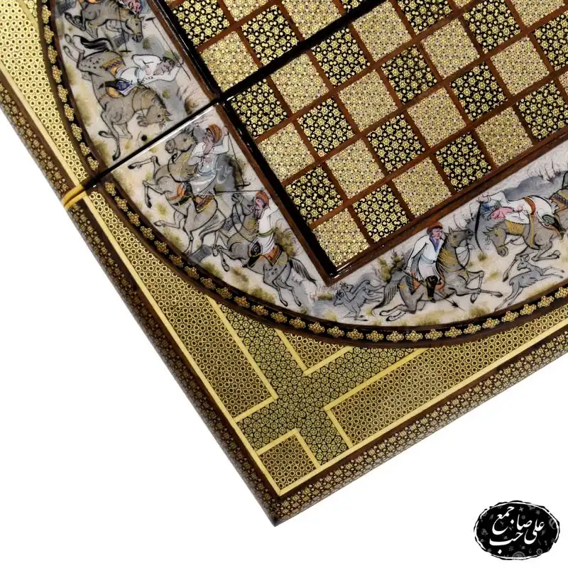 تخته نرد و شطرنج لبگرد خاتمکاری طرح اسبوچوگان یکی از آثار فاخر و اصیل اصفهان است که به دست استادکار برجسته، علی صاحبجمع برند تخته نرد اصفهان ساخته شده است. طراحی کنگرهای قاب، همراه با خاتمکاری نفیس و نقاشی هنری طرح «خرید تخته نرد خاتم و مینیاتور و اسبوچوگان»، جلوهای سلطنتی و متفاوت به این اثر بخشیده است.