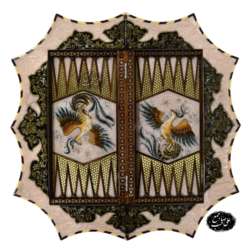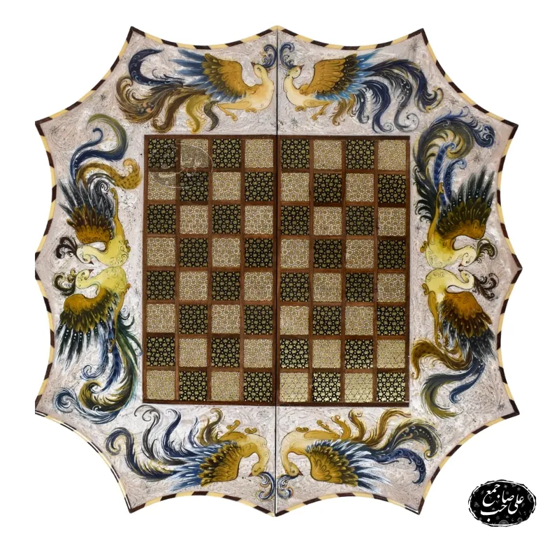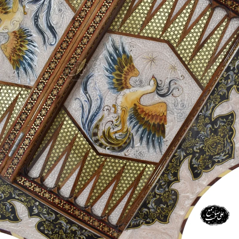 تخته نرد و شطرنج خاتمکاری طرح نقاشی سیمرغ با تذهیب حلکاری