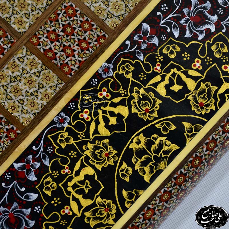 تخته نرد کنگره ای تذهیب 60سانتی خاتمکاری اجرا بر روی صدف مشکی و طراحی ختایی