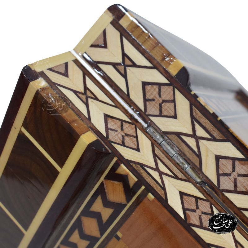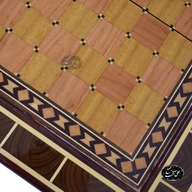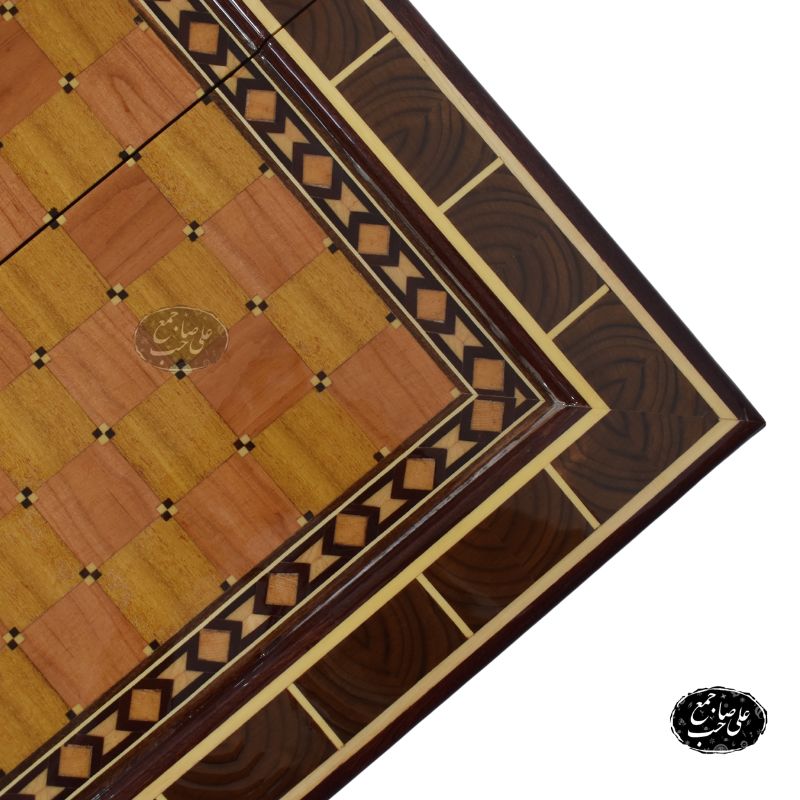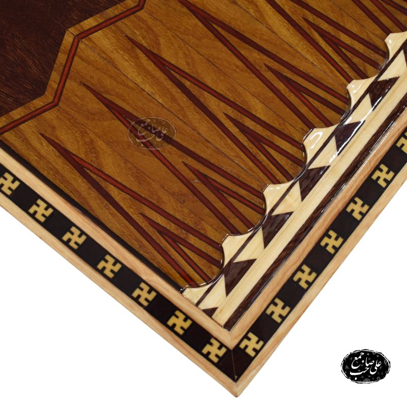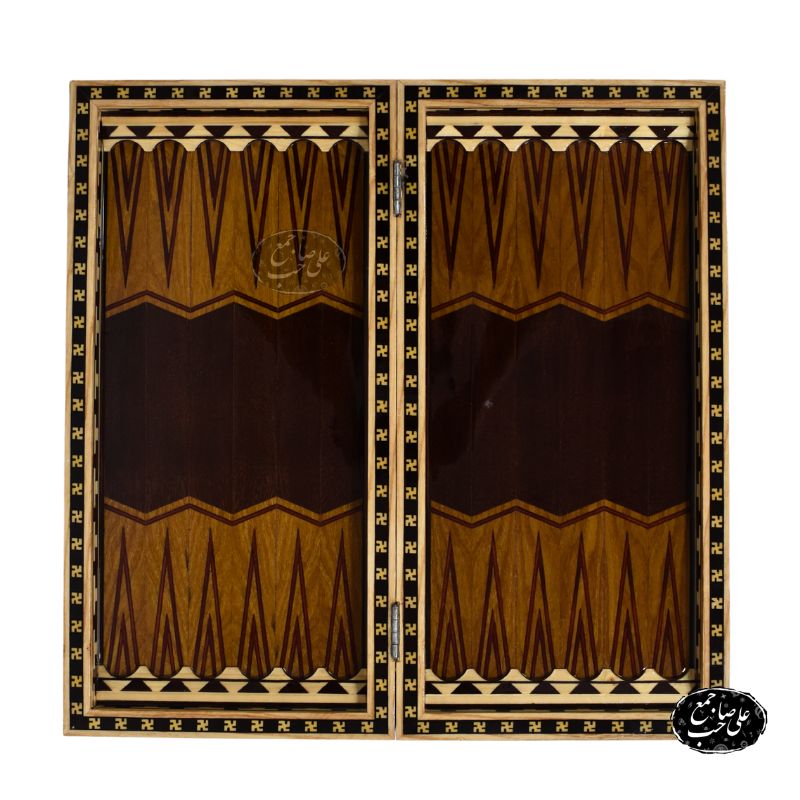 تخته نرد چوب گردو کد 203 یکی از شاهکارهای کارگاه استاد علی صاحبجمع در اصفهان است که از چوب گردوی طبیعی ساخته شده و در بخش داخلی آن از گرهچینی با چوبهای متنوع برای طراحی صفحه شطرنج و مارس استفاده شده است.